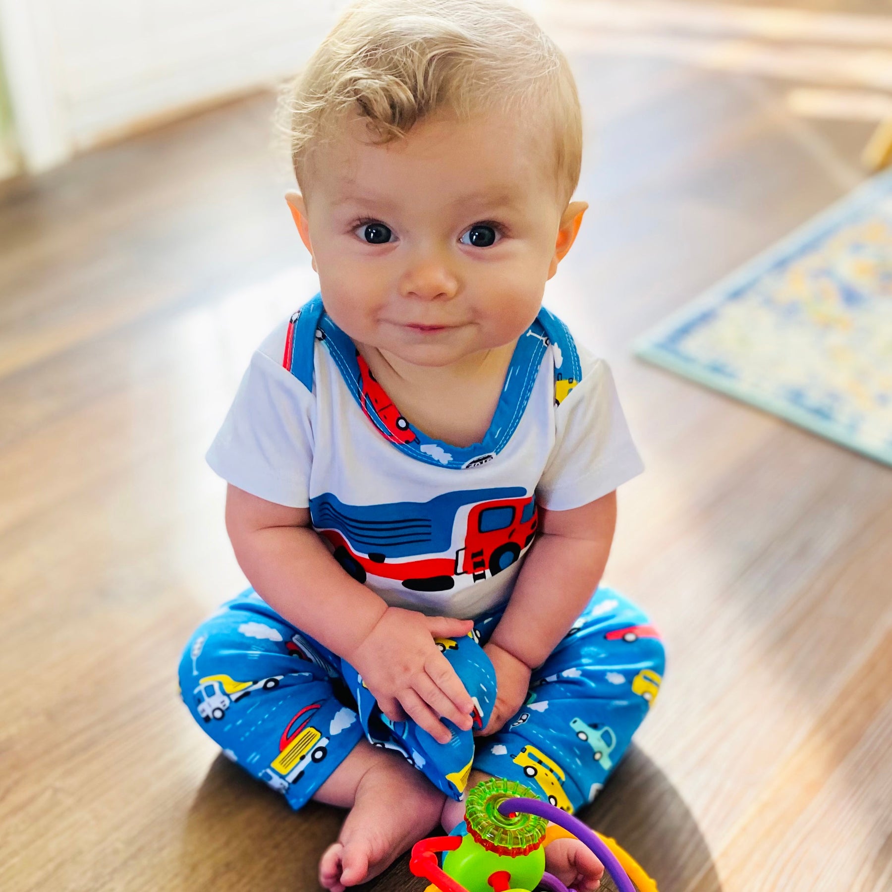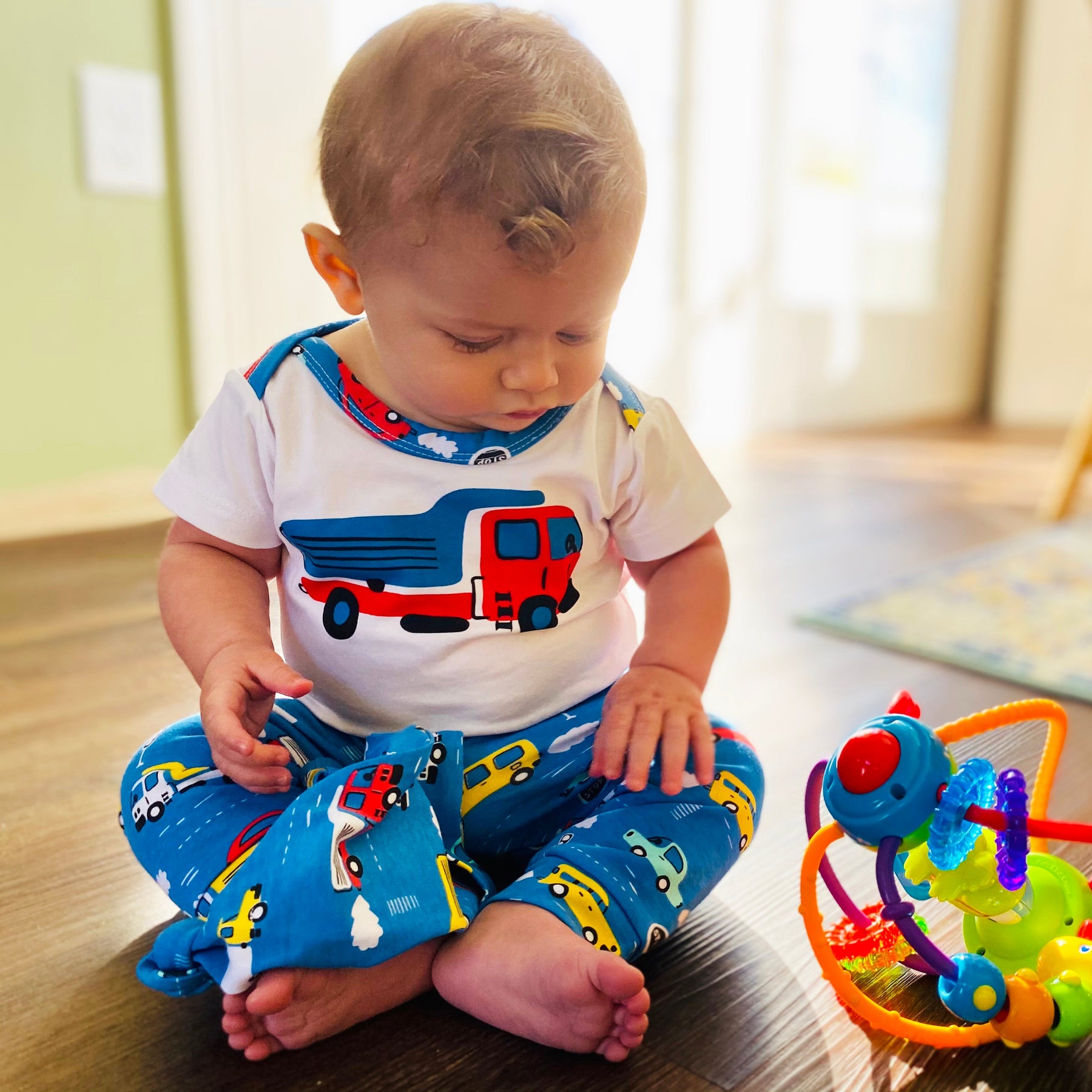3 piece Automobile Layette Gift Set features a one-piece bodysuit with diaper button fastenings for easy diaper changing and a matching pair of joggers/pants with Head Cap. The top features an adorable Truck silk screen appliqué. The fabric is an original AnnLoren design. The 95% high quality Egyptian cotton and 5% stretchy lycra fabric is SUPER soft and comfortable. Premium dye's ensure that your outfit won't fade or run. Machine Washable.