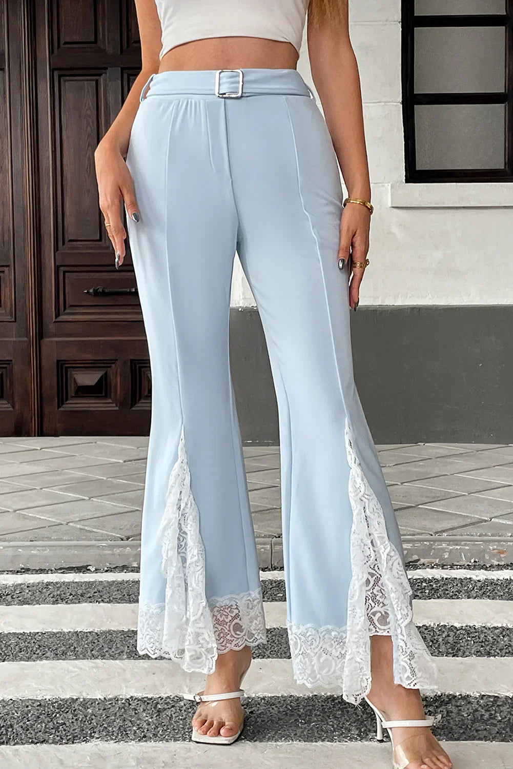 • The flare leg pants feature elegant lace detailing for a sophisticated touch.