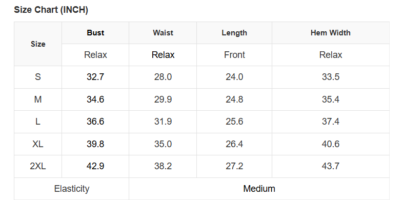 See size chart for approximate measurements.