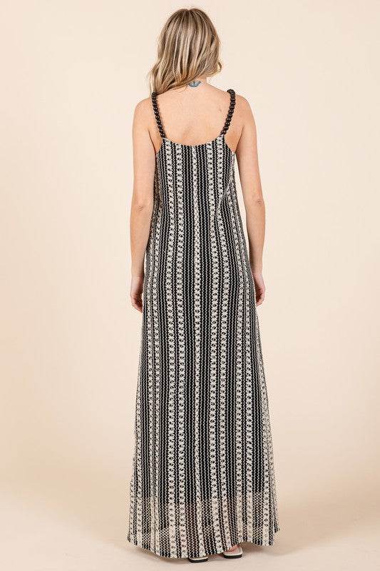 The Striped Scoop Neck Beaded Strap Maxi Cami Dress is a stylish and elegant piece featuring a striped pattern and a flattering scoop neckline. The beaded straps add a touch of glamour and sophistication to the dress, making it perfect for special events or evenings out. With its maxi length, this cami dress exudes a chic and sophisticated vibe, making it a versatile and timeless addition to any wardrobe.
