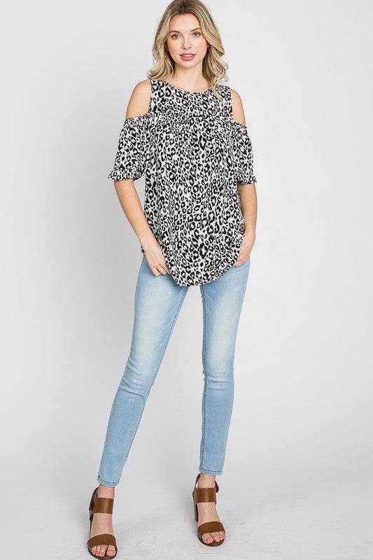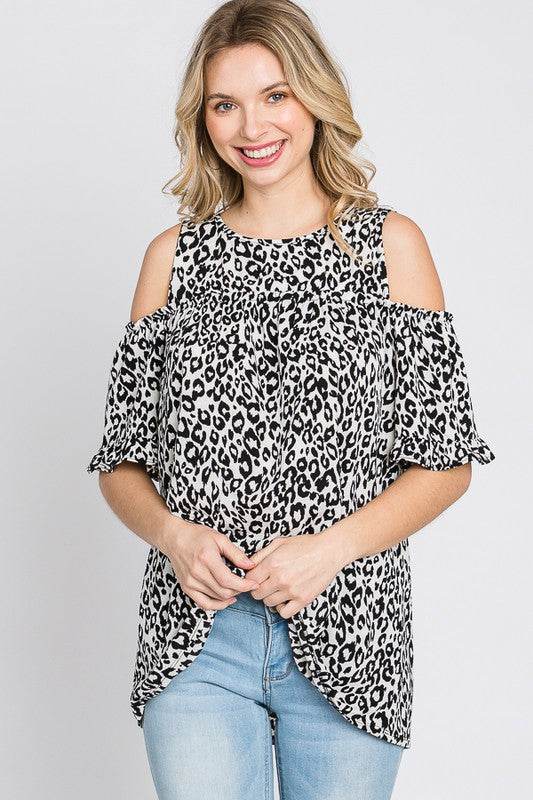 The Leopard Round Neck Cold Shoulder T-Shirt is a trendy and versatile piece that combines a playful leopard print with a modern cold-shoulder design. The round neckline adds a classic touch, while the cold-shoulder cutouts add a stylish and edgy vibe to the t-shirt. This top is perfect for adding a bold statement to your casual outfits and can be easily paired with jeans or shorts for a chic and on-trend look. With its trendy print and unique cutout detailing, this t-shirt is sure to make a fashionable statement.