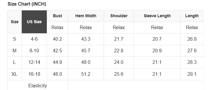 See size chart for approximate measurements.