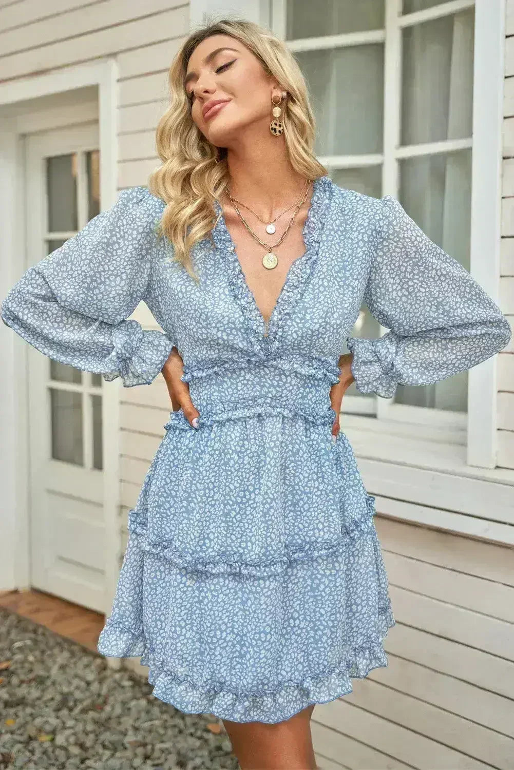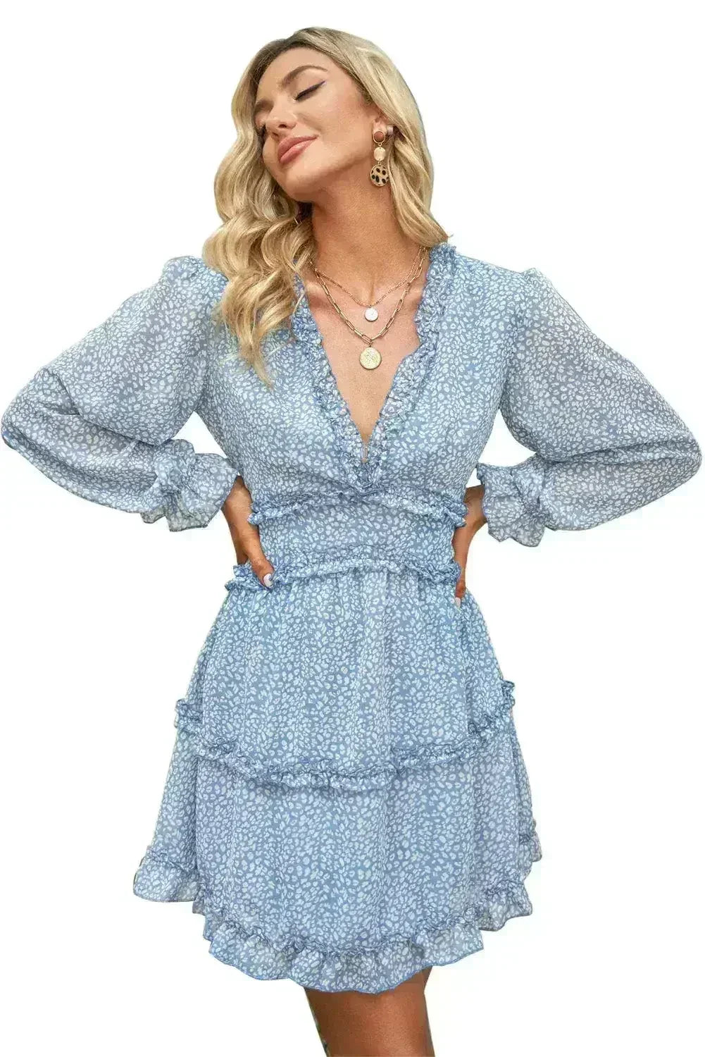 Sky Blue Ruffle Detailing V-neck Open Back Floral Dress