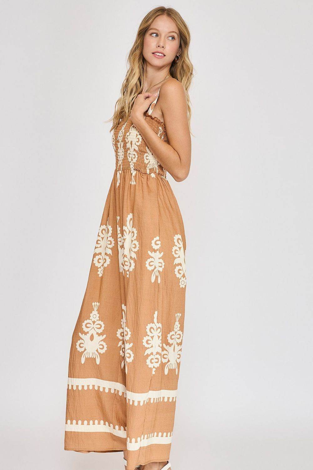 The Smocked Printed Wide Leg Jumpsuit is a stylish and versatile one-piece outfit that combines comfort with a trendy look. This jumpsuit features a smocked bodice for a flattering fit, a playful printed design, and wide-leg pants for a chic silhouette. Perfect for a casual day out or a summer event, this jumpsuit is a must-have addition to your wardrobe.