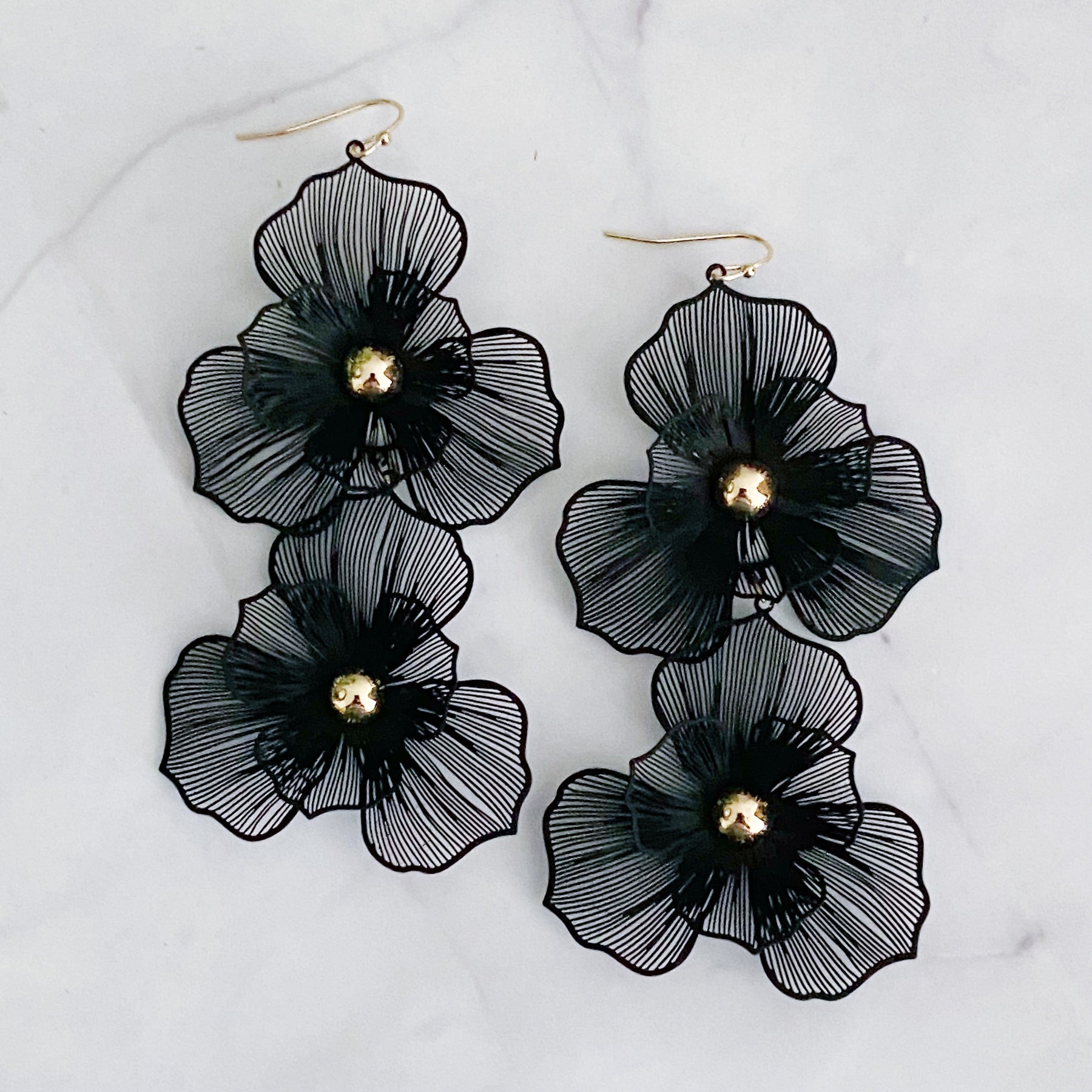 These Royal Garden Double Bloom Earrings offer a stunning accent to any look. Featuring two filigree flowers that hang together and make a beautiful statement, they are perfect for weddings, banquets, and photo shoots. With exquisite detailing, these earrings are sure to make a lasting impression.