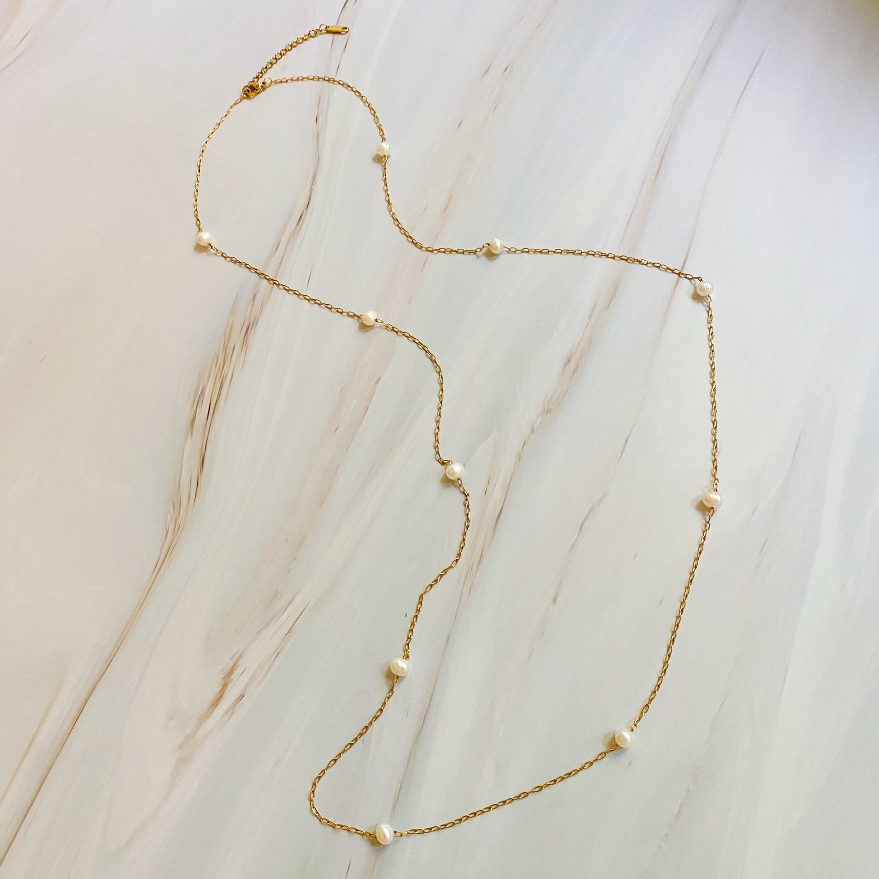 This Freshwater Pearl Long Chain Necklace is a timeless classic must-have. Real freshwater pearls and 18k gold-plated stainless steel chains create an elegant style necklace with maximum durability and tarnish-resistance.