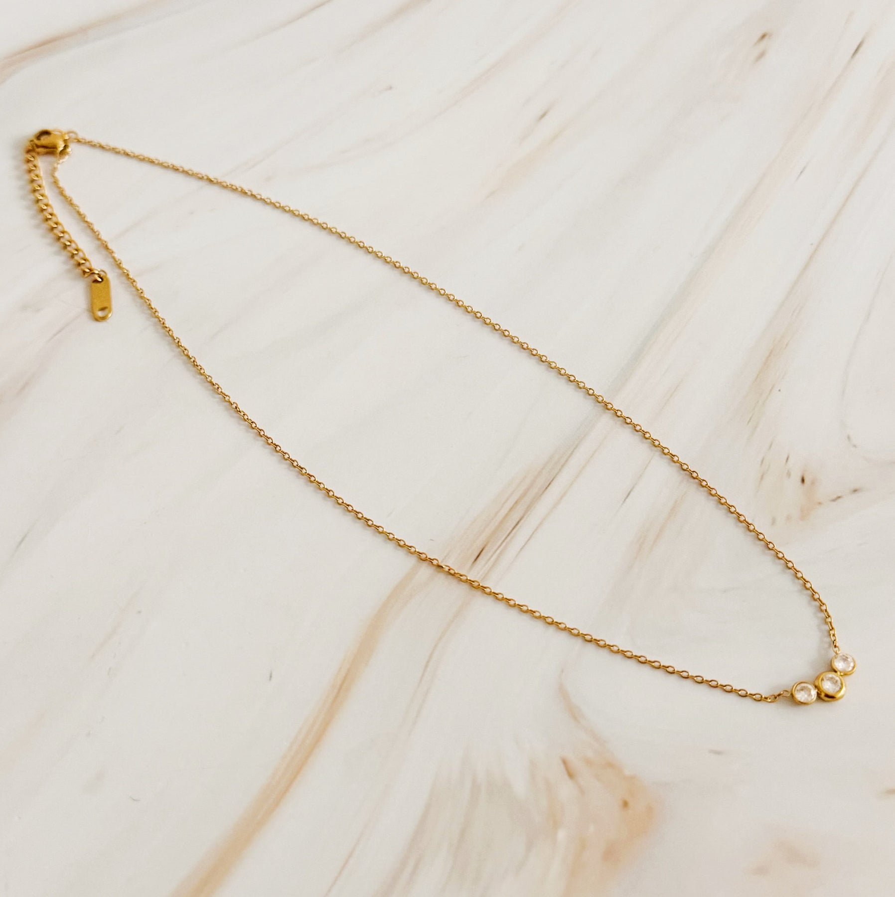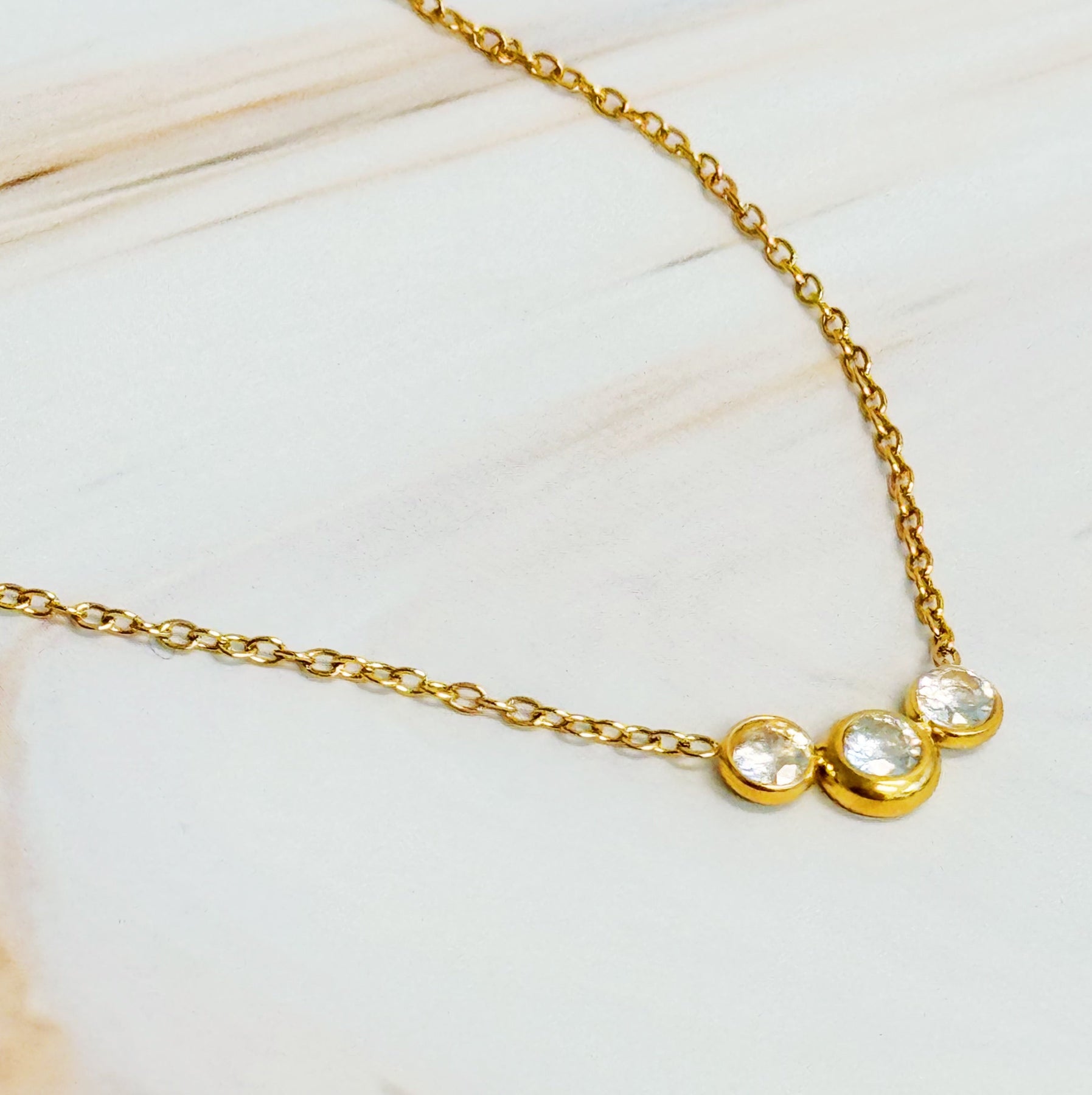 This minimalist three stones necklace offers a simple and elegant design with a hint of sparkle. Crafted to elevate any outfit, it effortlessly adds a touch of sophistication. With its dainty appearance, it's perfect for everyday wear or special occasions.