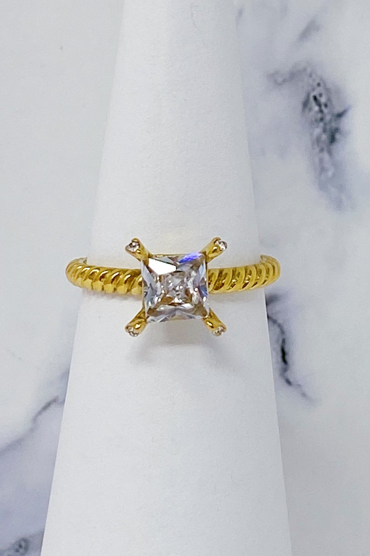 Absolutely gorgeous princess cut Cubic Zirconia shines just like a diamond. Has great details all around this beautiful setting. 4 high prongs with tiny CZ on top of them and textured slim band, simply gorgeous!