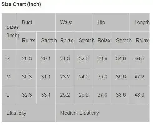| Sizes (Inch) | Bust | Waist | Hip | Length |