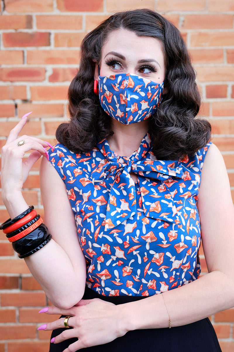 This top is for the vintage lover at heart!  Shown in our mushroom print, this 100% cotton top features bust darts for a flattering silhouette, a side zippered closure for ease of wear, and an oversized bow at the neckline for that perfect 1950's inspired look.  Shown with Black Charlotte Skirt.