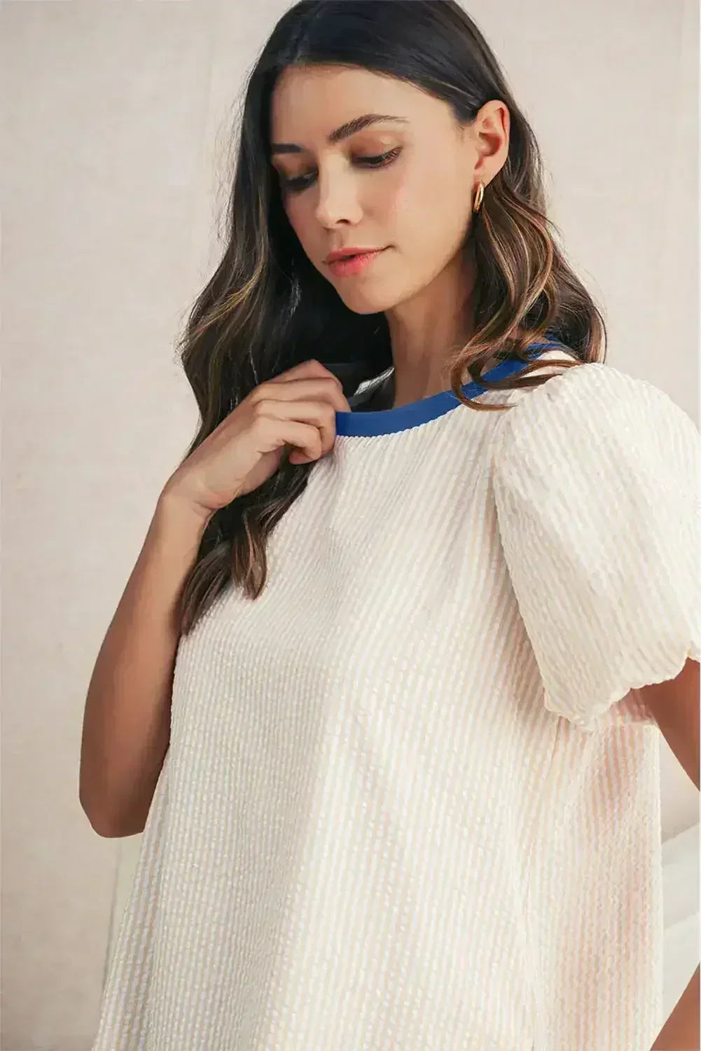 The textured fabric adds a touch of sophistication, while the puff sleeves bring a fun and trendy element to your look.