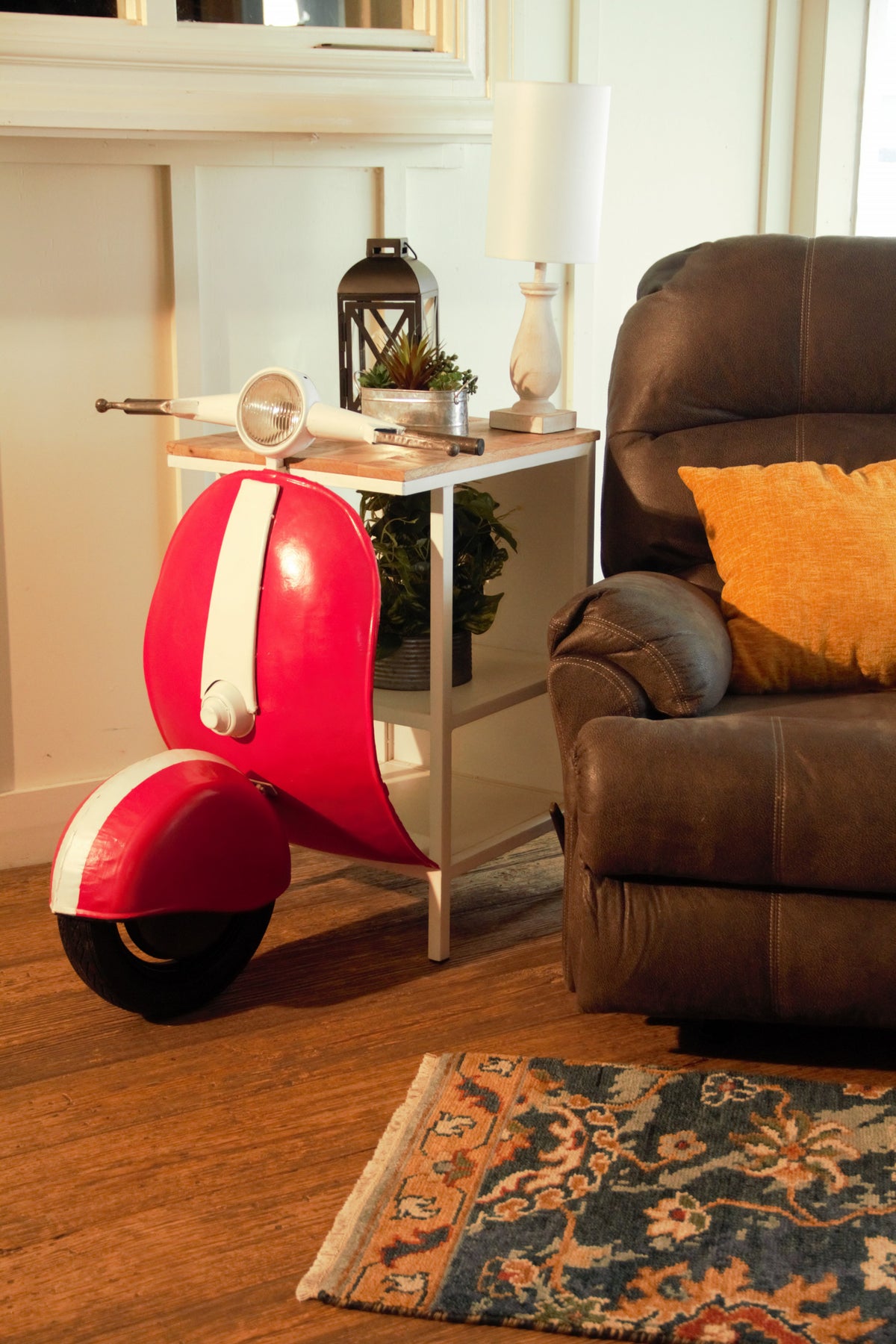 Dress up your dining room, living room, bedroom, or hallway with this fun 26" red and off white novelty scooter open cabinet with two shelves. Display and storage vessels don't have to be unsightly. Made from repurposed metal and genuine mango wood, this rustic and distressed cabinet is good looking and unique. Increase your storage space and the fashion quotient of your room with this hard wearing, versatile, and good looking conversation piece/cabinet. 40" H x 26" W x 39.5" D