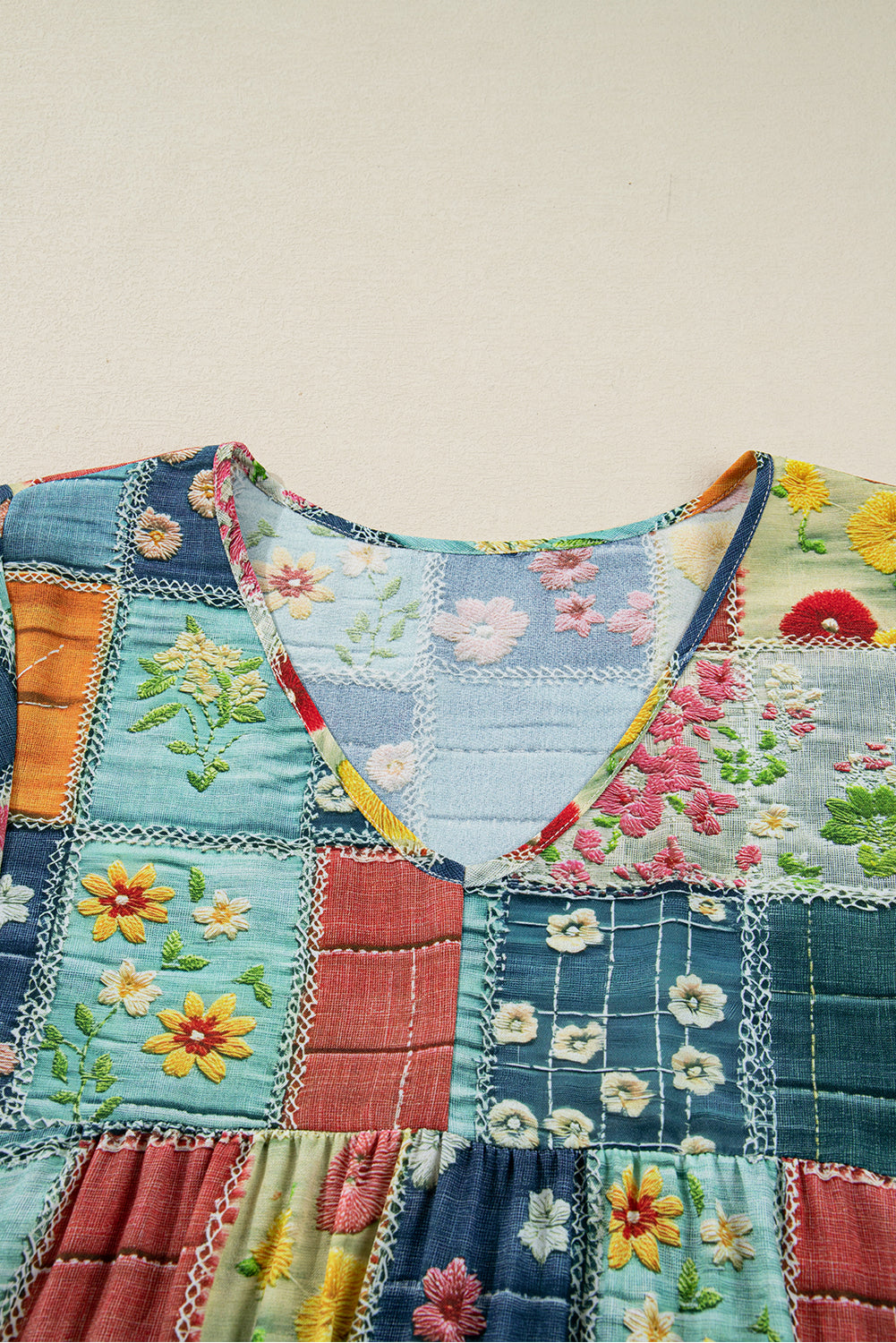 Floral Patchwork Long Sleeve Ruffle Hem Midi Dress